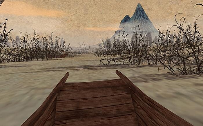 「神遊幻境」取材自院藏趙孟頫〈鵲華秋色〉,此卷是為了一解同鄉周密思念原籍之愁所畫,讓其可馳騁遨遊於濟南山水間。在悠遊趙孟頫所描繪的濟南秋景旅程中,可走入畫中小屋子細端詳原畫之丹青墨韻,或輕搖小舟,悠然擺渡於古黃河舊道間,近觀沙渚樹石、屋舍羊群等,領會文人贈畫傳統下的深厚情誼。