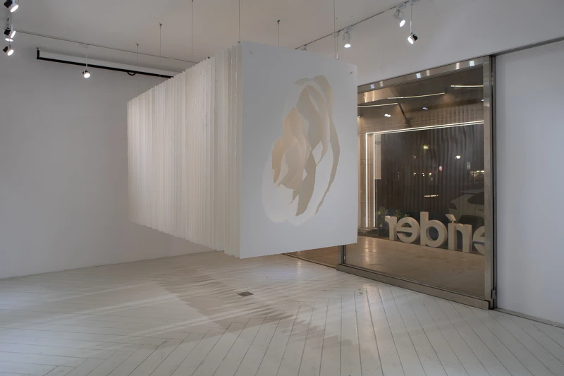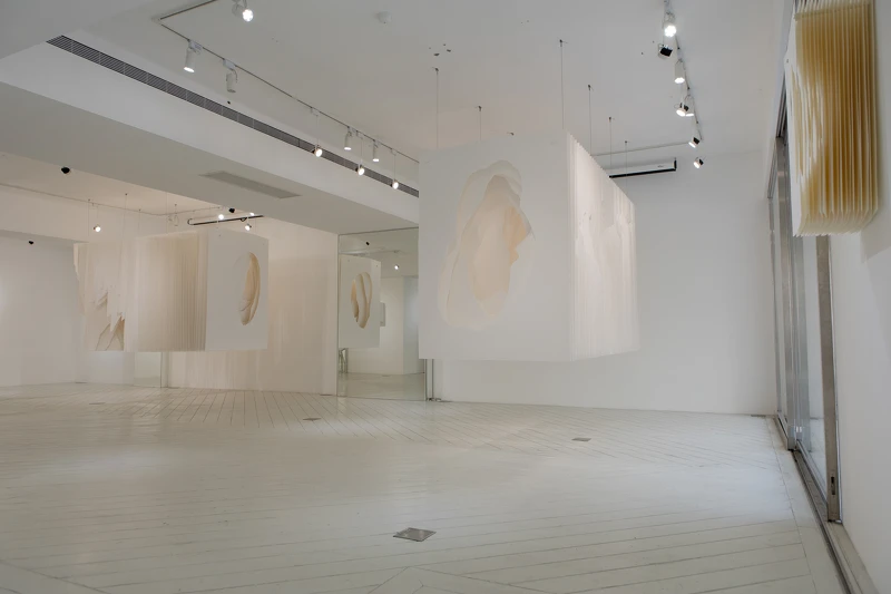 此次個展的主要作品包括一件長達六米、由兩件三米紙雕組合而成的雕塑,自展場正中懸掛的紙張連續重疊,並撕裂其中部分區塊,撕裂痕跡通過層層疊疊的光線折射,在紙邊緣及表面上產生了戲劇性的光影效果,紙張邊緣線條相對銳利,與內部撕裂的空間產生了強烈的衝突感,以及動人的韻律感。另外一件大型作品,觀賞甚至能鑽身進入紙雕中,觀看內部在精心設計的光線打亮後,彷彿置身洞穴的魔幻感。