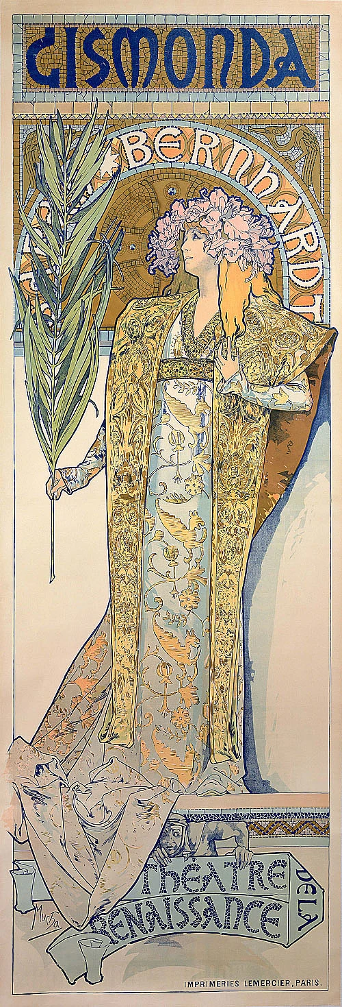 這是由法國劇作家薩爾杜所撰寫的四幕劇《吉絲夢妲》,1894年秋天,於巴黎復興劇院(Théâtrede la Renaissance)首演。在本劇中,知名演員莎拉・伯恩哈特(Sarah Bernhardt)既是導演又是演員,而慕夏為此劇製作的海報,將莎拉・伯恩哈特繪製成一位拜占庭貴族,展現了她獨特的美麗高貴。海報不僅深得莎拉・伯恩哈特喜愛,也自此奠定慕夏大師地位。
