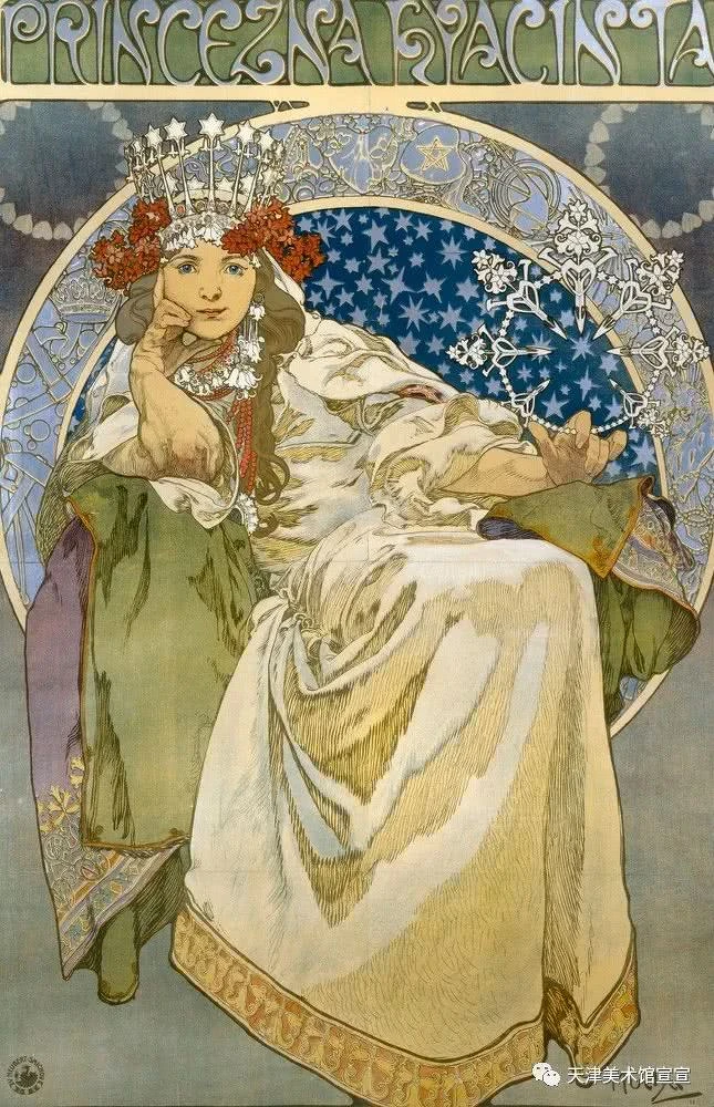 1911年,在布拉格國家劇院首演的芭蕾舞劇《風信子公主》,廣告海報交由慕夏繪製。畫面中的女主角,是當年極受歡迎的女演員 AndulaSedláčková。海報中的裝飾細節,皆巧妙運用風信子圖案,不僅襯托著女性柔美身體曲線,也帶出畫面的細緻華麗。