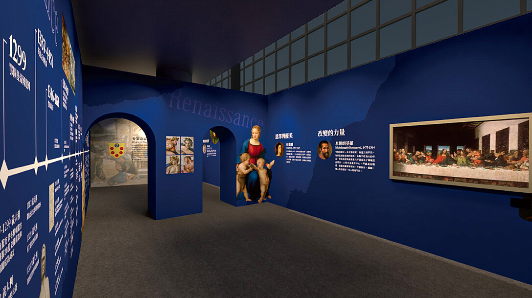 回顧600年前文藝復興的輝煌歷史,策展單位選取了文藝復興從早期至晚期代表畫作,梳理不同時期畫作的特點,並折射對應東西方背景歷史。長廊中可以看見影片、圖表、原寸複製畫及場景重現的展示手法,讓觀眾回到文藝復興時期,親身領略「文藝復興三傑」達文西、拉斐爾、米開朗基羅,以及喬托、提香等20位大師的經典風采。