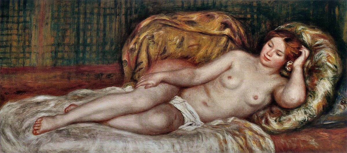 「痛苦終將消逝,唯有美麗永存。」身為印象派代表人物,法國藝術大師雷諾瓦曾畫下了〈煎餅磨坊的舞會〉等經典作品,除此之外,他也十分擅長描繪女性身形。這次被收錄於《經典裸體》中的〈大裸女圖〉是雷諾瓦較為晚期的作品,他沒有用任何宗教、神話故事來包裝裸身,反而相當大方地呈現女體樣貌。(在此提供一個雷諾瓦的有趣故事,雷諾瓦作畫速度極快,甚至他的某些經典創作,僅花不到半小時便宣告完成。)
