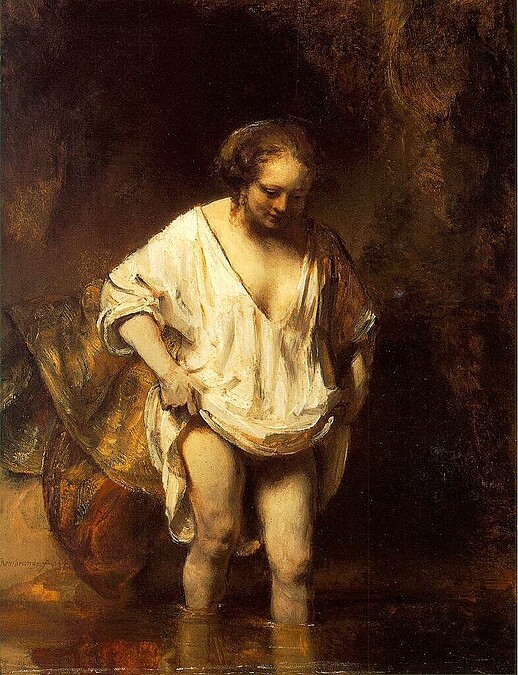 雖然逝世超過三百年,但荷蘭著名畫家林布蘭的新聞卻持續攻佔媒體版面,足證他在世人心目中的地位有多崇高。讓我們回到林布蘭的年代,來看看〈沐浴溪間的韓德瑞各〉畫中的情慾意涵,當時女性假如僅穿著一件襯裙現身,便帶有極其強烈的性感意味。畫裡的女人,也許是林布蘭的愛人之一,在如舞台光源的強烈照射之下,畫中女子提起裙擺並緩步往前走去,完美展現林布蘭的動人畫作風格。