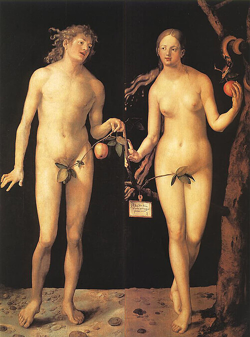 由德國著名藝術大師杜勒創作的〈亞當與夏娃〉,畫出了每個人都熟悉的故事,性與原罪、墮落劃上等號,這兩幅畫作亦成為德國歷史上首次呈現與真人同等大小的裸體畫。充滿線條的青春肉體,在畫面裡展現鮮明的動感,堪稱裸體藝術中的絕美之作。