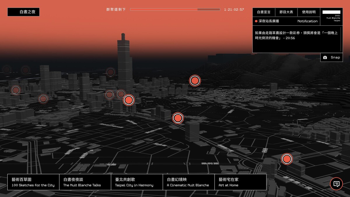 2021臺北白晝之夜活動網站「晝夜轉運站」 ,將在一夜限定的12小時內接力完成多項藝文活動企劃、展演。網站也會提供多人線上聊天室創造新群聚模式,打造前所未有的線上藝術共遊體驗,只要打開電腦動動手指,就能打破藩籬,突破實體活動的區域限制,感受特有的「線上感Interoperability」,展現後疫情時代的藝文產業數位轉型力量,再次以藝術連結所有人!