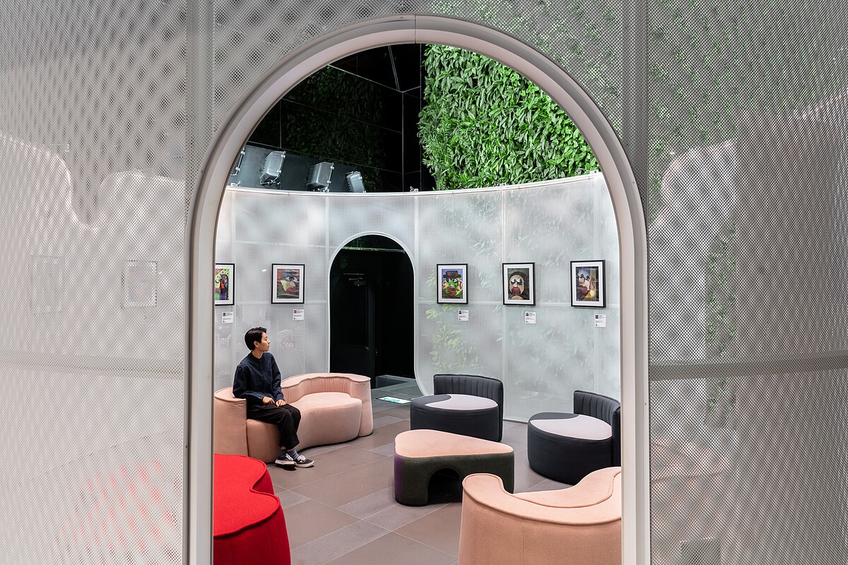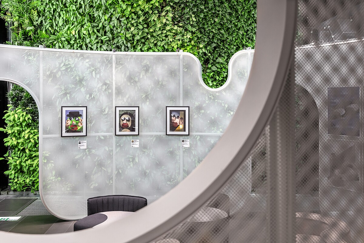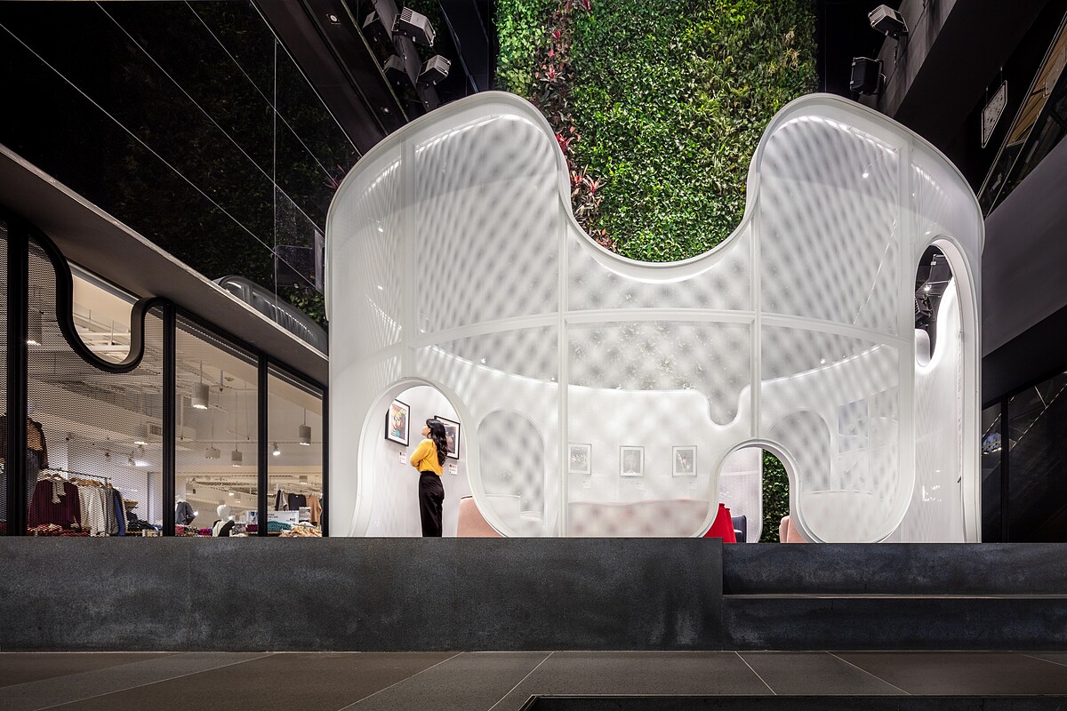 王喆建築師將植生牆比喻為「樹」,以「雲朵」隱喻充滿想像力的自在空間。大小曲線流動而成的開口、若隱若現看見裡外的白色框構,柔軟了金屬面料的剛硬;令人可以自由穿梭出入,又或扶梯兩旁探頭而視,親身體驗與想法交流的虛實交錯,也讓雲端空間多了幾分溫度。