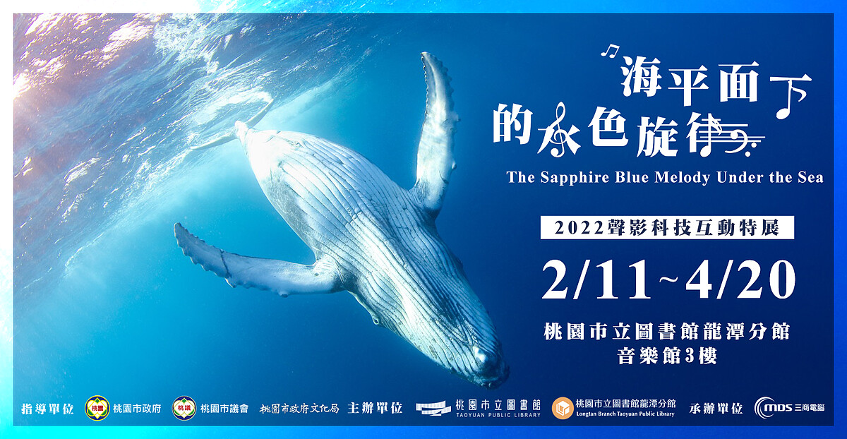 「海平面下的水色旋律」將自2/11~4/20在桃園市立圖書館龍潭分館展出。用聲影科技帶領大家到湛藍的海平面之下,跟著金磊老師聆聽同為依海而生的地球住民——鯨魚的歌聲演奏。