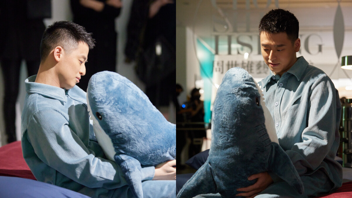 以今年四月就要停產的 IKEA 鯊魚為創作靈感,藉由鯊魚從不睡覺,但大家買它卻是做為睡眠陪伴的消費行為,諷刺地表達人類與動物的關係。作品的物件緊扣海洋元素,藍色象徵「大海與自由」;勃根地紅的毯子象徵「血腥」;虎皮地毯則雙重呼應動保議題,以幽默、童趣的方式,包裝殘酷且哀傷的訊息。