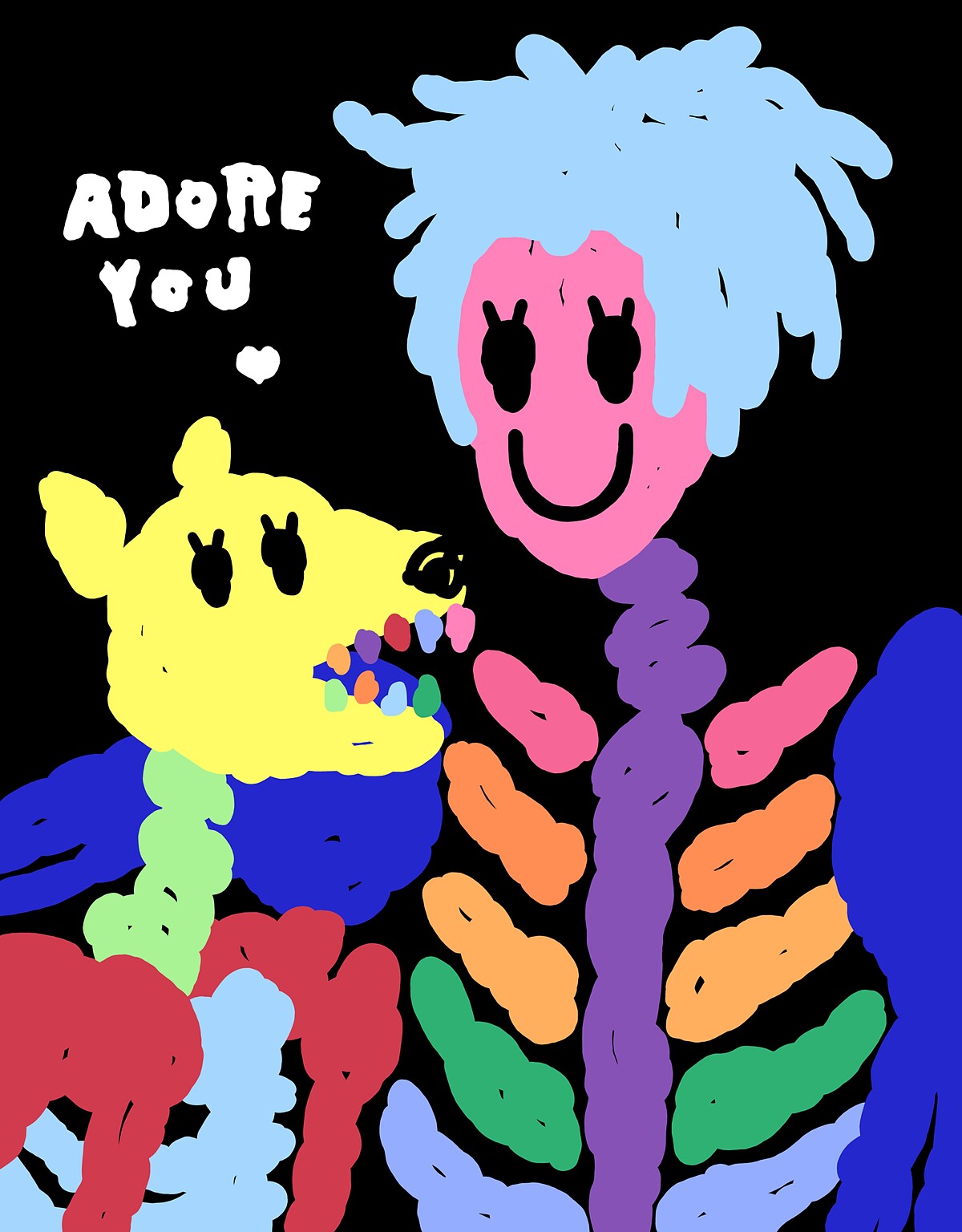 有別於其他件作品常使用的線條勾邊,這件作品朱晨維嘗試以單純色塊呈現整個畫面,並運用高彩度的顏色凸顯主要物件,與背景低彩度的黑形成強烈對比,試圖加深人類與狗之間的情感關係。