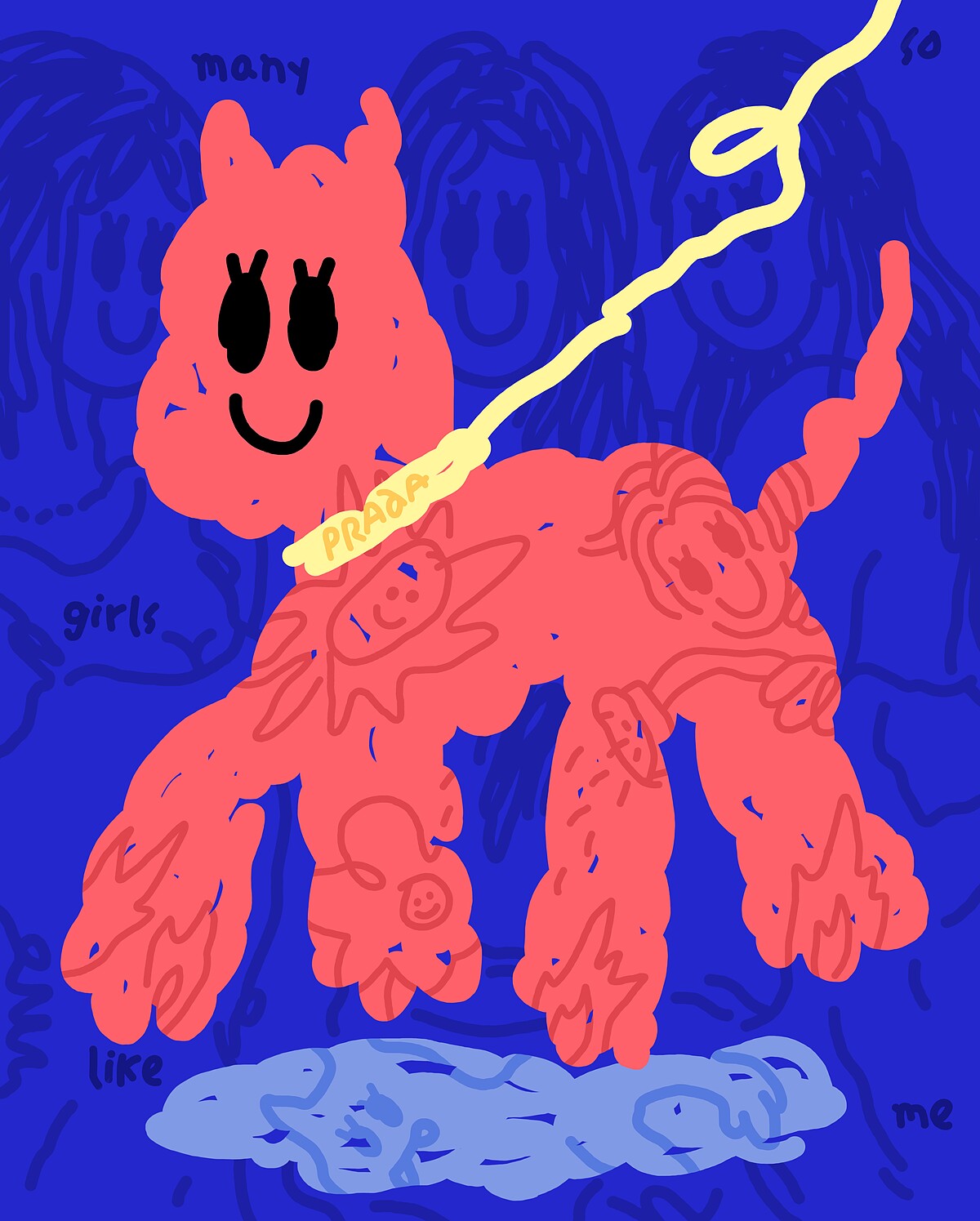 此作品運用狗作為主題創作,並透過看似平常的遛狗畫面,表現世俗眼光的再現與掙扎。狗的面部表情呈現了標誌性的微笑符號,紋身內容隱喻現代社會當中「必要」與「需要」之間的荒唐,在大面積鈷藍背景裡,暗藏人類注目的眼光,讓充滿自我矛盾的畫面,一切彷彿是如此的自然、合理。