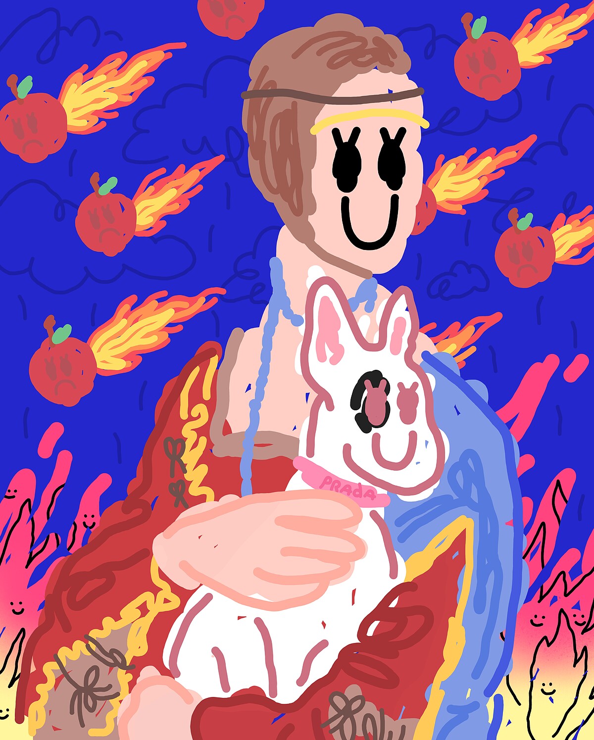 此作品致敬Leonardo da Vinci於西元1489年所畫的《Lady with an Ermine》,以富有現代語彙的物件置入其中,呈現21世紀獨特景緻。畫面當中墜落的蘋果、斷訊藍屏上的暴雨,反應現代社會的「快」與「雜」,也正因這些紛亂的存在,凸顯前方女子與狗的平靜和諧。此作品捕捉衝突與和諧交織的場景,目的在於呈現社會的多元及多樣,即便看起來有些許違和,那也無妨!
