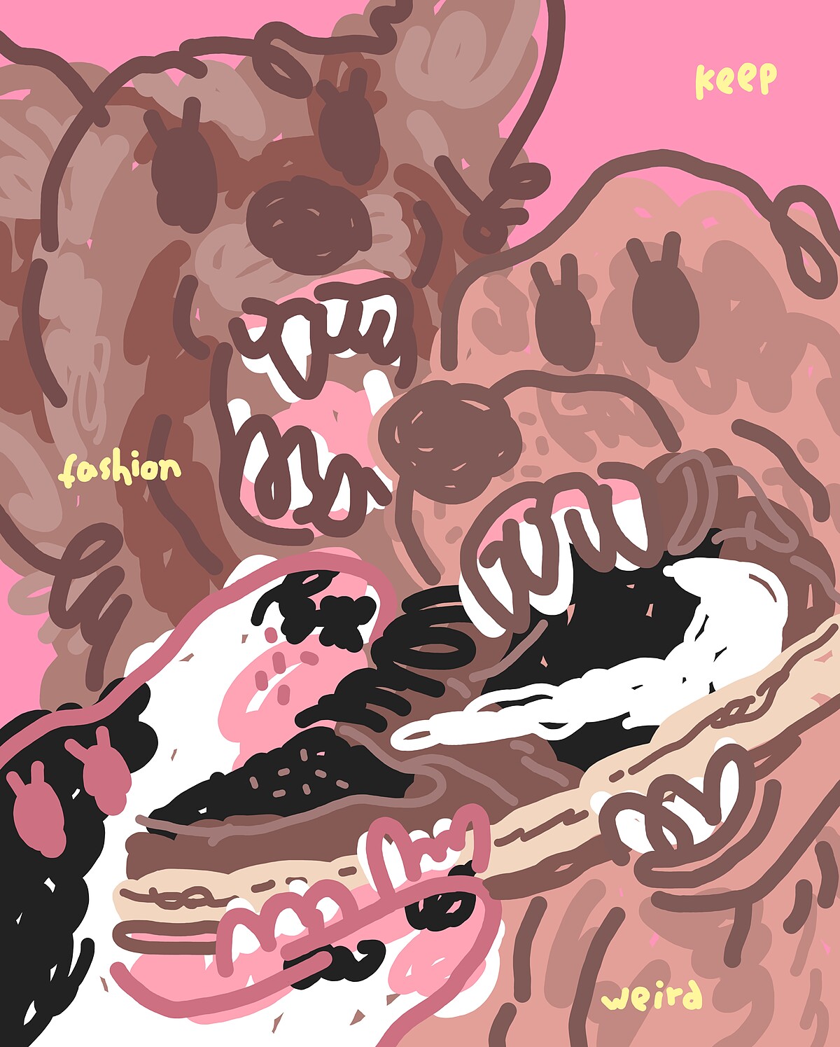 炒作(Hype)在現代社會已經形成不可或缺的趨勢,且任何範疇皆可能觸及。作品題材中的狗帶有寓意性,透過動物來扮演人類的角色,目的為人性視角的再現,並藉此展現時下人們對於慾望的各種追求。透過三隻狗搶同一隻球鞋,呈現炒作文化在球鞋圈的影響力,其中也包含了集體焦慮與自我認同的問題,使作品形成映照人與時代的反射。
