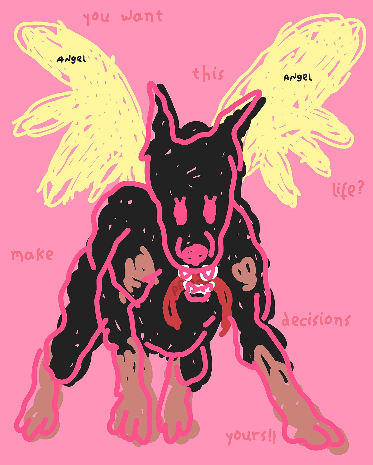靈感源自於《穿著PRADA的惡魔》中的經典名言"You want this life?Make decisions yours!"。口中咬著的項圈,象徵心中想達成的目標,而身後金黃色翅膀則作為前進的動力,並烙印上Angel字樣,是追逐目標過程中的自我期許。朱晨維利用這件作品去反思生活,且試圖用文字及物件構成的語彙去回應生活,另外,將作品名稱中「Proud of」改成「PRADA」,產生諧音與概念上的雙重趣味。