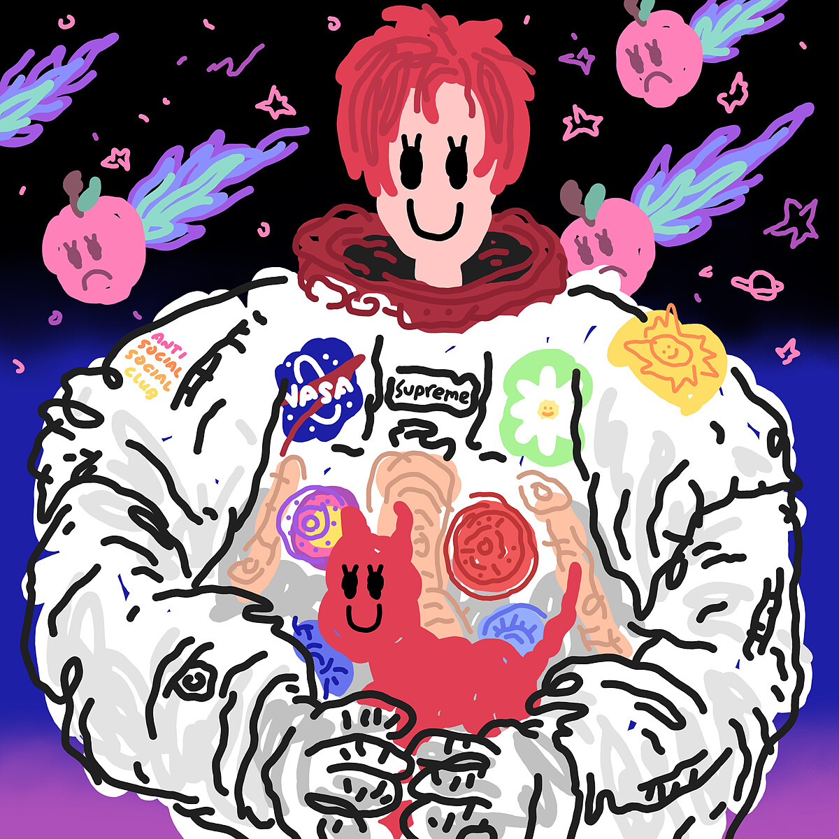 創作,對朱晨維來說是回應生活,也是一個自我實現的過程。記得小時候的夢想是當太空人,即便現在的身分不是太空人,但是朱晨維能利用作品去實現這個夢想!朱晨維把情感投射在畫面中人物的身上,太空服上的標語、徽章顯示出青少年時期的種種自我矛盾,而後方不斷墜落的隕石雨增添了戲劇性的成分,使情緒不斷在兒時夢想與現實生活這兩者之間穿插,最終定格在微笑的瞬間。