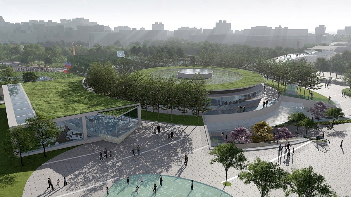 從示意圖來看,地下層會有高低錯落的量體設計,形塑公園中波浪起伏的立體地景;而最迷人的便是接待大廳有「玻璃天窗」能引入日然灑落的日光,將光線照射至地下層區域中,恣意觀展途中也能沐浴自然光。入夜後,地下室內區域也因為透明結構,會成為迷人柔性光環境,將都市氛圍再提升。