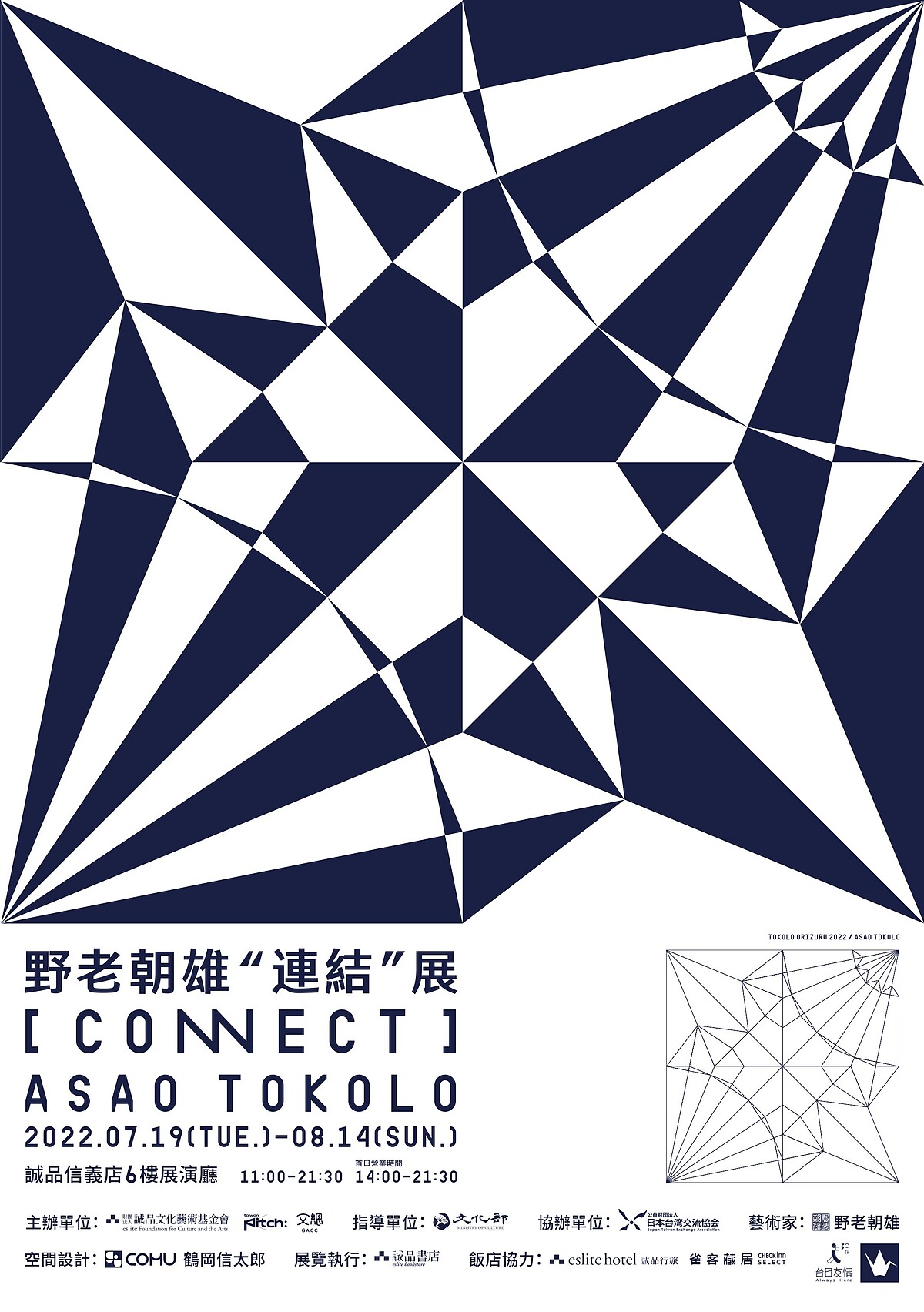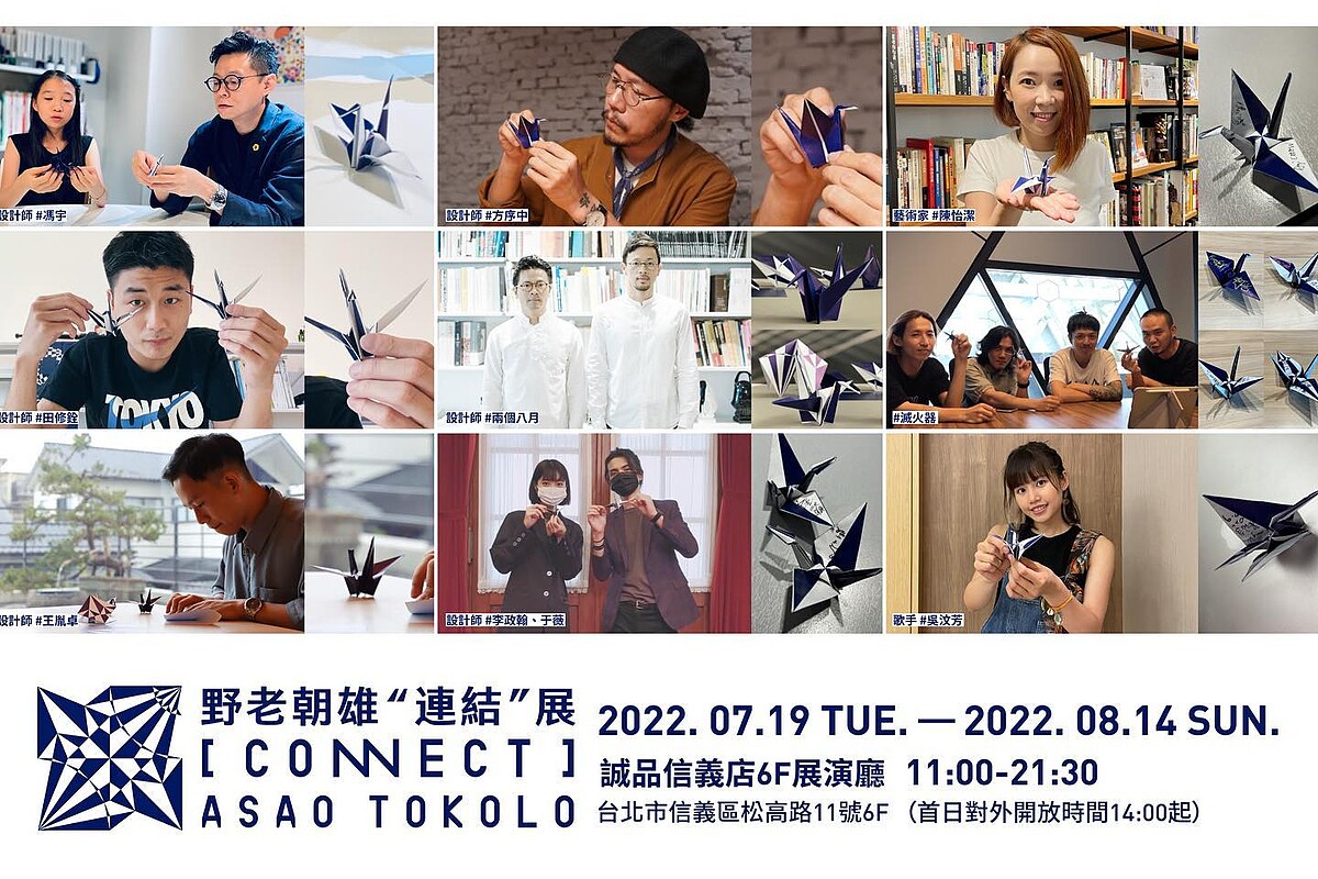 《野老朝雄"連結"展 ASAO TOKOLO[CONNECT]》將自7月19日起,於誠品信義店6樓展演廳展出,與台灣民眾的共創新作「祈福千紙鶴」專用紙,可於文化總會1樓限量免費索取。而野老朝雄此次來台過程,Taiwan Pitch 將以紀實影像的形式紀錄,未來透過國際影音串流平台 TaiwanPlus 展現給全球觀眾,展覽詳細資訊可參考文總官網及臉書專頁。
