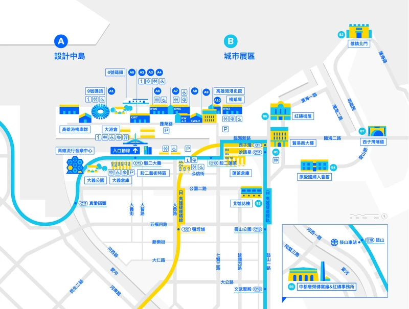 輕軌:駁二大義站 步行約 1分鐘 通過大港橋即可抵達設計中島。