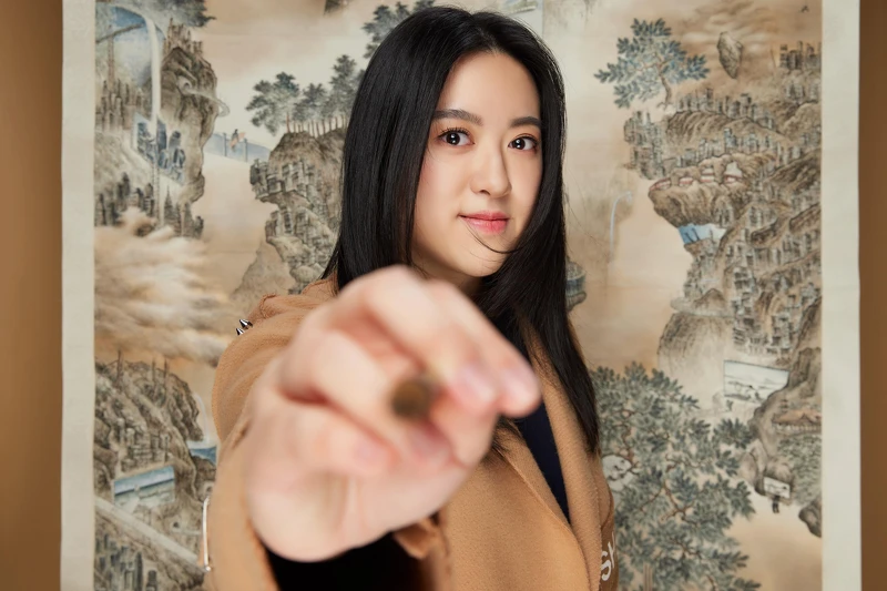 而擅長結合東西方元素的她,此次令人驚艷的當代山水系列,皆以台北故宮水墨經典構圖,結合個人生命經歷而成。作品《憶》為開啟水墨畫的起始,以萬壑松風圖為藍本,記錄高中與高中之前的見聞,以家為起點,描繪了生命中每個時期的見聞與記憶,而總長365cm的橫幅畫作《初》則以黃公望富春山居圖為基,呈現大學的生活印記,並提上感悟字句,柔和亮麗的色彩也將山水畫注入個人特色。
