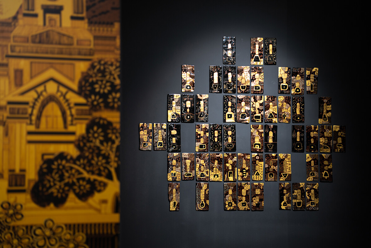 這裡則是將「黑漆描金」應用到當代藝術,KCG邀請東西方藝術家展出創作。亮點有中國藝術家翁紀軍的大型雕塑《矗2018》,在三根立柱上呈現漆器創作的各個階段。以及長期研究漆藝的法國藝術家文森漆(Vincent Cazeneuve),以金、銅、錫三種金屬色澤,結合「黑漆描金」技法創作出的大型漆片矩陣《無題》2023。