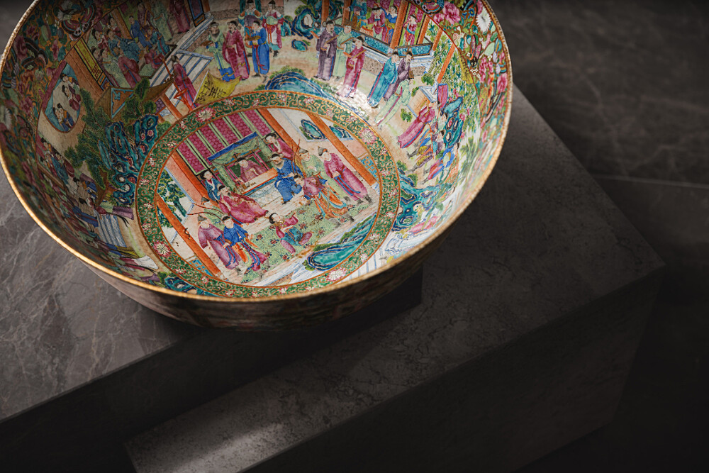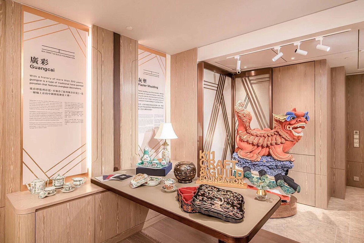 在 K11 ARTUS 十樓,有著一間隱匿於房間廊道的「KCG Private Gallery」,或許能當作KCG珍視傳統工藝的精神濃縮。這間宛如巨型多寶閣的展示廳,設有基金會的常設展《尋古探今》,開放給所有住客參觀。展示廳中陳列著KCG焦點關注的五大工藝,分別是──「灰塑」:中國嶺南地區傳統建築裝飾工藝,常見於屋脊和高牆上的彩色雕塑及裝飾;「廣彩」:廣州彩瓷,也稱作廣州織金彩瓷,是以釉上彩的繪瓷技藝;「螺鈿」:將貝殼鑲嵌在漆器、木器或金屬表面,形成色彩斑斕的裝飾技術;「百寶嵌」:以玉石、瑪瑙、珍珠等奇珍異石嵌入木料或漆器表面的名貴工藝;「木建築」:中國古典營造的重要技法,精密的木建築設計可藉由木材的嵌合而不使用任何固釘,也寓意天人合一的宇宙觀。KCG將多件運用這五項傳統工藝的古董收藏展示在此,希冀啟發更多人對傳統工藝的愛惜與重視。