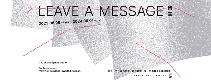 自8/9起至9/1展出的《Leave A Message留言》,來自影視暨文學領域、企業界、當代藝術領域、舞蹈劇場、實驗音樂領域的參展藝術家群 —何采柔、舞蹈家周書毅、聲響音樂家劉芳一、企業家邵永添、知名導演吳念真,主視覺由設計師方序中設計,他對此表示「我們很少會擁抱身邊最親近的人,或許事隔多年,不容易再見面的時候,會覺得很遺憾,有沒有想過,如果那時候再跟他/她多講一句話呢?是不是可以彌補內心的遺憾?」