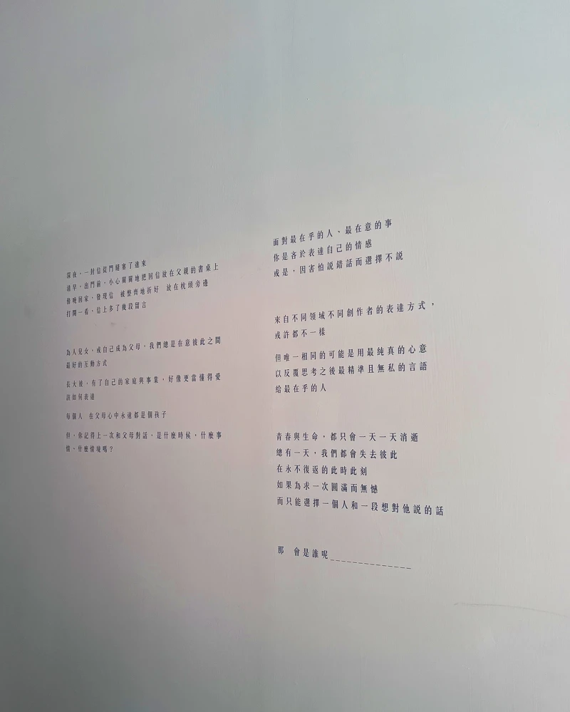 希望觀眾與展覽所產生的連結,透過展覽的動線、作品、聲音、視覺等,激起人們珍視生活中那些具有特殊意義而留下來的訊息,無論是即時傳遞,或拼湊出生命歷程的原貌,展覽給予一個機會,可以把深藏在內心許久的一句話,跟一個很重要的人說,不一定是家人,也可能是陌生人或記憶中帶給你啟發的一個人,好好地傳遞埋藏已久的訊息。