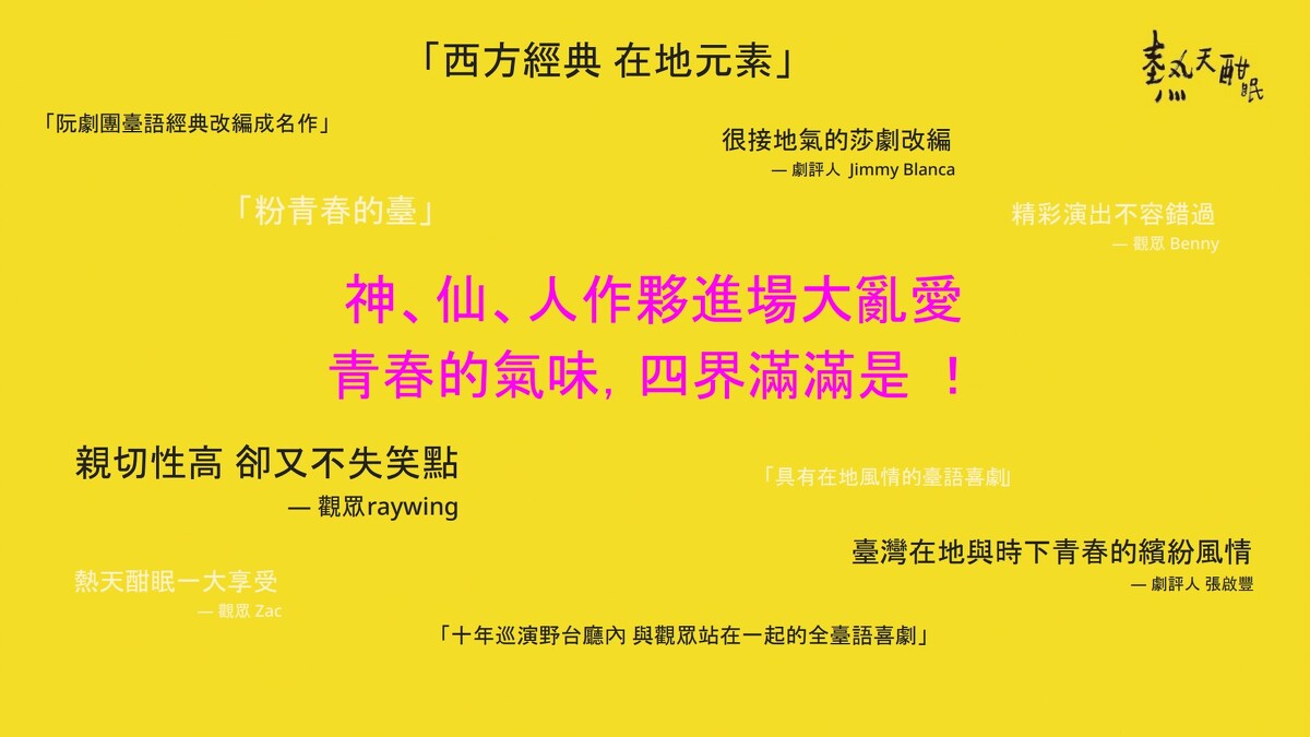 我們將《仲夏夜之夢》中的仙王、仙后,改編成山神(土地公)、海神(媽祖),這點真的很有趣!讓我們本土的觀眾可以更加貼近戲劇!過去台灣大眾好像都覺得舞台劇是一種很有距離、很藝術的呈現方式,但《熱天酣眠》這齣劇其實與觀眾的距離是很小很小的。真的有很多長輩看完後,很開心地回饋給我們說「有這種戲要再找我來看!」此外,熱鬧又喜慶的情節真的是大人小孩都適合,完全可以闔家觀賞!