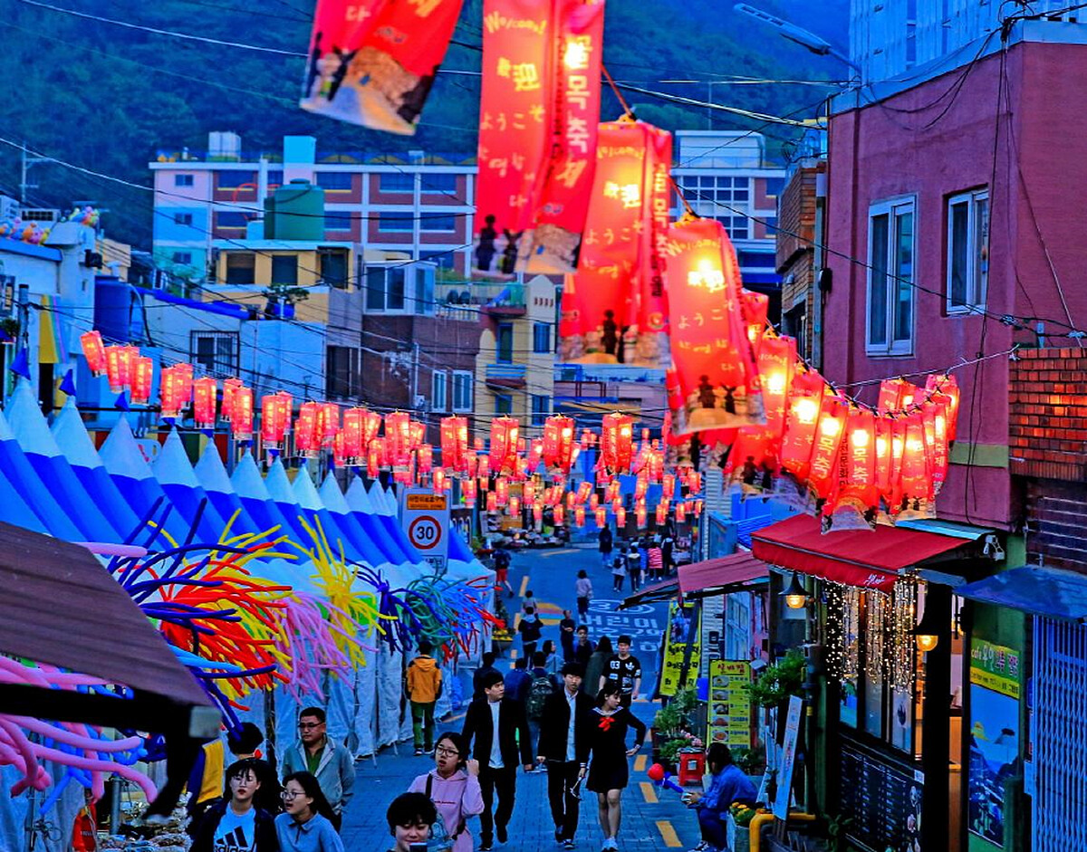 位於釜山最大海鮮市場札嘎其對面的奚琴藝術村,穿過影島大橋便能抵達。而奚琴藝術村原是韓國修理造船的小鎮,但隨著地方人口老化,而後逐漸發展為藝術村。濃濃的漁港味搭配上隨處可見的彩繪藝術,吸引大批遊客前往觀光。如果還想一覽藝術村及造船所的風景,這裡也提供遊覽船的搭乘。到札嘎其市場品嚐完海鮮,別忘了繞過來欣賞造船藝術村。