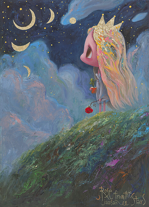 向來擅長油畫風格的 JAMSAN,近期的創作主題圍繞著「女孩」。以女孩作為畫作主角,她總是靜靜地坐著並手持玫瑰搭配背景閃爍的繁星,如此美好的畫面,彷彿就在訴說「女孩就是在綻放星空中唯一的一朵玫瑰」,寓意在人生的路程中敞開手擁抱相遇的一切事物,即使中途迷失方向也要微笑前進,如同 JAMSAN 的期待,即使可能會脆弱害怕,也要拾起勇氣,探索未知的未來。