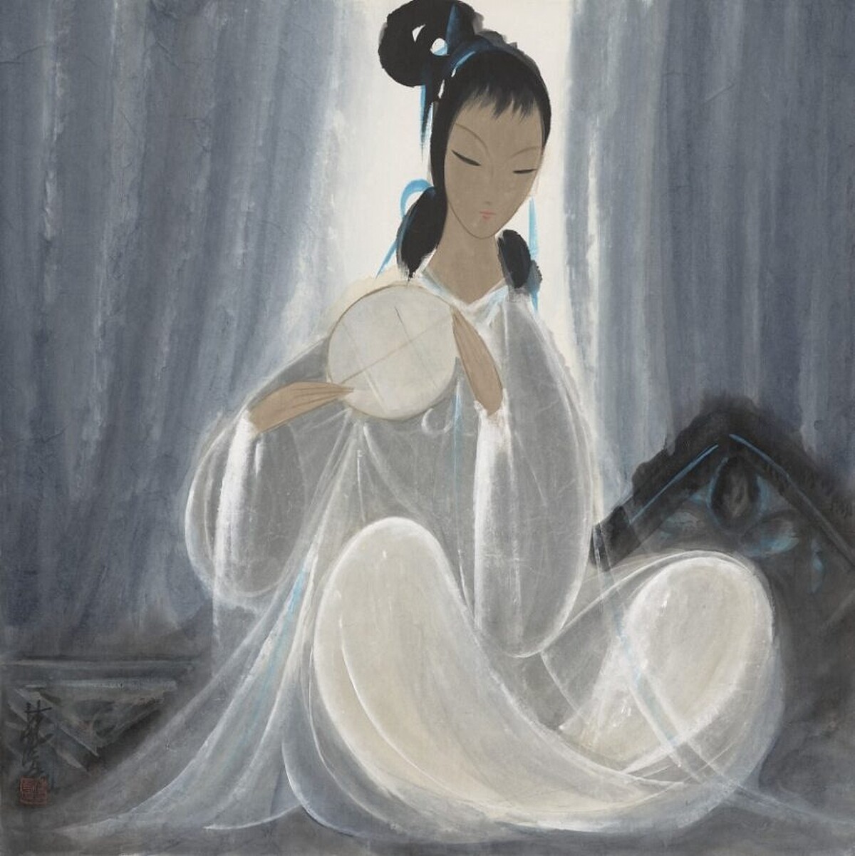 林風眠以仕女圖聞名,深受西方油畫影響,回國後的作品以水墨方式呈現如同西畫一般的立體感,衣物的飄逸與透明質地展現不凡的畫家功力。