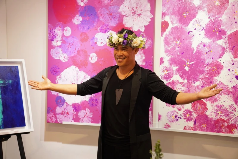 優席夫今年春日之際,更創作出2024限家作品《繁花若夢》(White and pink)將台灣東部家鄉部落的扶桑花璀燦閃耀於畫布上展開如夢似幻的美麗境地。