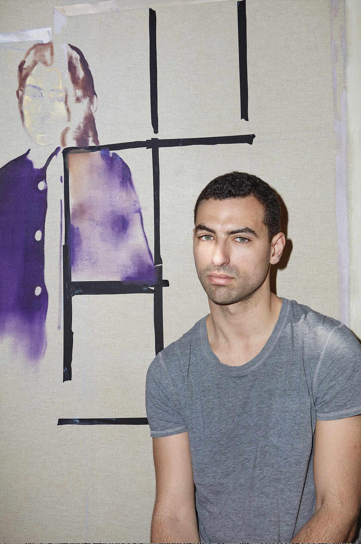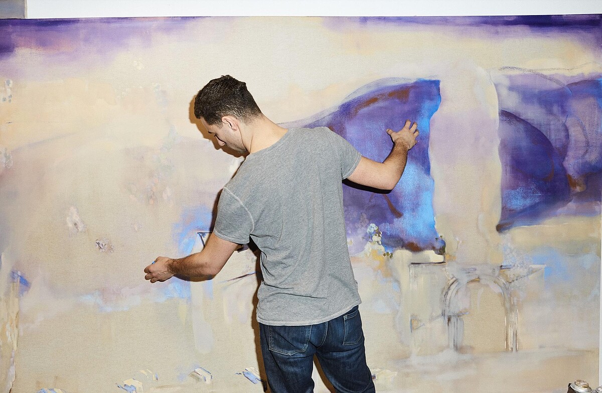 DB:我用油彩在畫布上一層又一層地上色,並留下一些完全沒上色的地方,就是你看到的那些淡棕色、表面較為粗糙的地方。至於那些紫色、米色和黃色,都是油彩的痕跡,帶著紅棕的色調。然後在這些區塊的上層,我再用粉彩上色。過去我創作過不少關於記憶和懷舊的主題,所以需要一種能夠展現顏料層層堆疊的技巧。而粉彩會隨時間逐漸褪色的⋯⋯就亮層層的油彩一樣,它們都帶有個字的含義。對我來說,真正的限制是使用這種紫色。這個顏色很強烈,非常難以處理。你要嘛淡化它,或是讓其他顏色更顯突出。這之中,反覆嘗試的部分是最困難的,在駐村的第一個月我非常擔心。但老實說,每個人都是。最後一切都順利解決了,但我必須堅定立場。