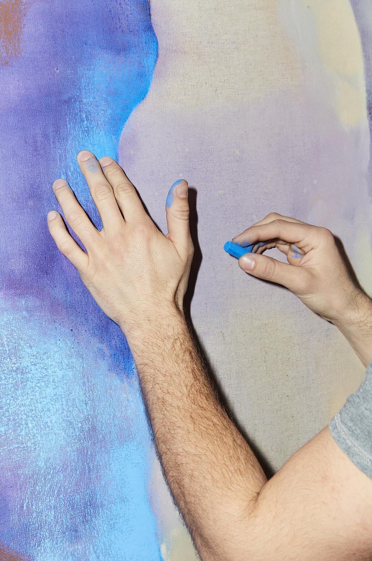 在抵達這裡以前,我已經用過粉彩,但方式非常細緻。在這個空間裡,我第一次試圖達到和李禹煥作品一樣的效果,很激烈地摩擦粉彩,把它放到畫布上擠碎,製造出厚厚一層霧面粉彩效果。我比以前邁出一大步,創造出這種厚實又純粹的質地感。這次駐地經驗完全顛覆我過去的技術,我知道我會持續探索這個新發現。