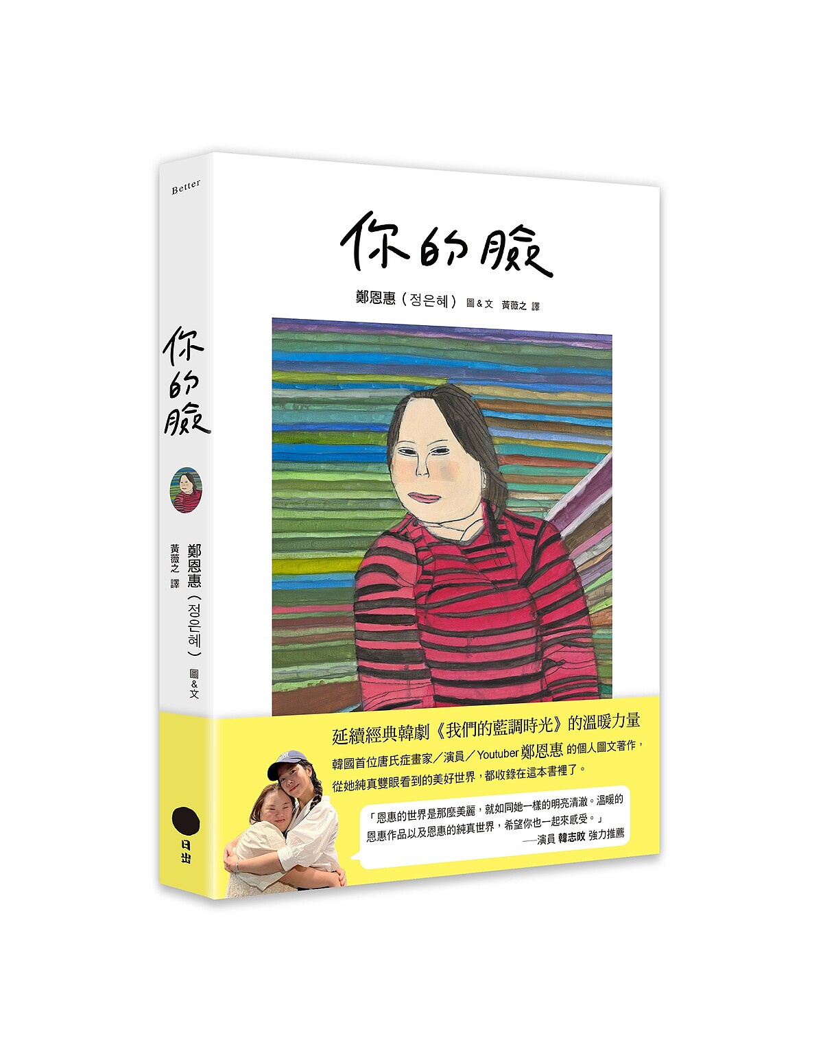 鄭恩惠的第一本圖文著作《你的臉》繁體中文版(日出出版),也將同步於6月初在台出版上市。裡面收錄了她自2013年開始作畫以來,令人印象深刻的代表性繪畫作品,包括素描誇飾畫、彩繪壓克力畫等,書中文字也都由恩惠撰寫,出自她的日記、詩和寫給家人的信,滿滿純真溫暖的力量,是她送給大家的療癒禮物。本書並獲得2023年度韓國世宗圖書支援事業評選優良讀物,將優先由政府採購,提供給韓國各地圖書館。