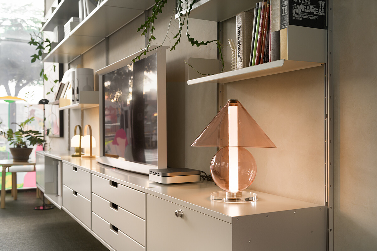 一進忠孝門市,便可以看到由 Jaume Ramírez 設計的 Milana 系列,這個「可移動的光點」是這個系列最大的特色,也可以模組化,透過配重零件,當它懸掛在兩點之間,便可隨意垂直或水平移動;而重新詮釋傳統檯燈,由 Jaume Ramírez 設計的 Fragile,則是在疫情期間設計,以玻璃象徵當下狀況的脆弱。設計師利用燈罩分散光線,玻璃圓錐體與圓柱體,經典的幾何造型,使光線溫暖、漫射且漸變;擅長形塑奢華飯店室內風格的 Yabu Pushelberg 設計的Konoha,是一個簡單低調的壁燈,透過光線探索情感的可能性,可作為溫暖的環境照明,也可作為閱讀燈;而 Jordi Canudas 設計的 Dipping Light 以手工塗料技術創作,燈泡產生同心圓般的色彩分層,光線散發出不同彩度與紋理。