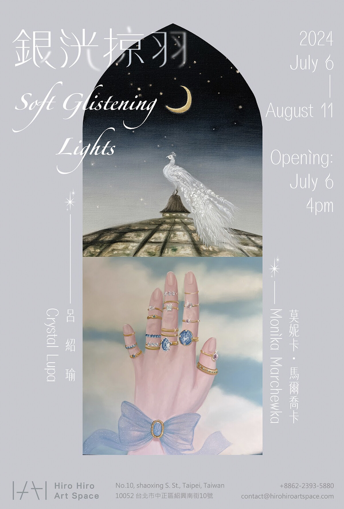一隻手伸向天空,試圖感受溫柔的風掠過指尖,手指上寶石在陽光映照下閃閃發光;星光熠熠的夜空下,白孔雀的羽毛與月光相輝映,宛如披上細緻的刺繡長袍⋯⋯由藝術空間 Hiro Hiro Art Space 呈現,「銀洸掠羽」邀請藝術家呂紹瑜(Crystal Lupa)與莫妮卡.馬爾喬卡(Monika Marchewka)以銀波般閃爍的水光和輕柔的氛圍為題,即日起至8月11日舉行雙人聯展。