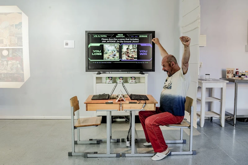 《VS AI》是一件以遊戲方式,體驗人工智慧創作的裝置作品,玩家可以根據機台系統出的題目,透過文字生成圖像的方式,輕易體驗人工智慧創作生成影像的過程。同時依據題目,思考、想像與創意輸入描述文字,產生圖像。這個作品在「文化燉」展覽中以「傳統市場」為主題,由製作團隊設定多種文生圖題目中,例如心目中的台灣的傳統市場、特定小吃長什麼樣子?讓芬蘭在地觀眾可以體驗透過AI生產出想像中的台灣市場與飲食樣貌。展場上還設有電腦對戰模式,供兩位觀眾同時參與,並投影展示他們共同生成的作品。
