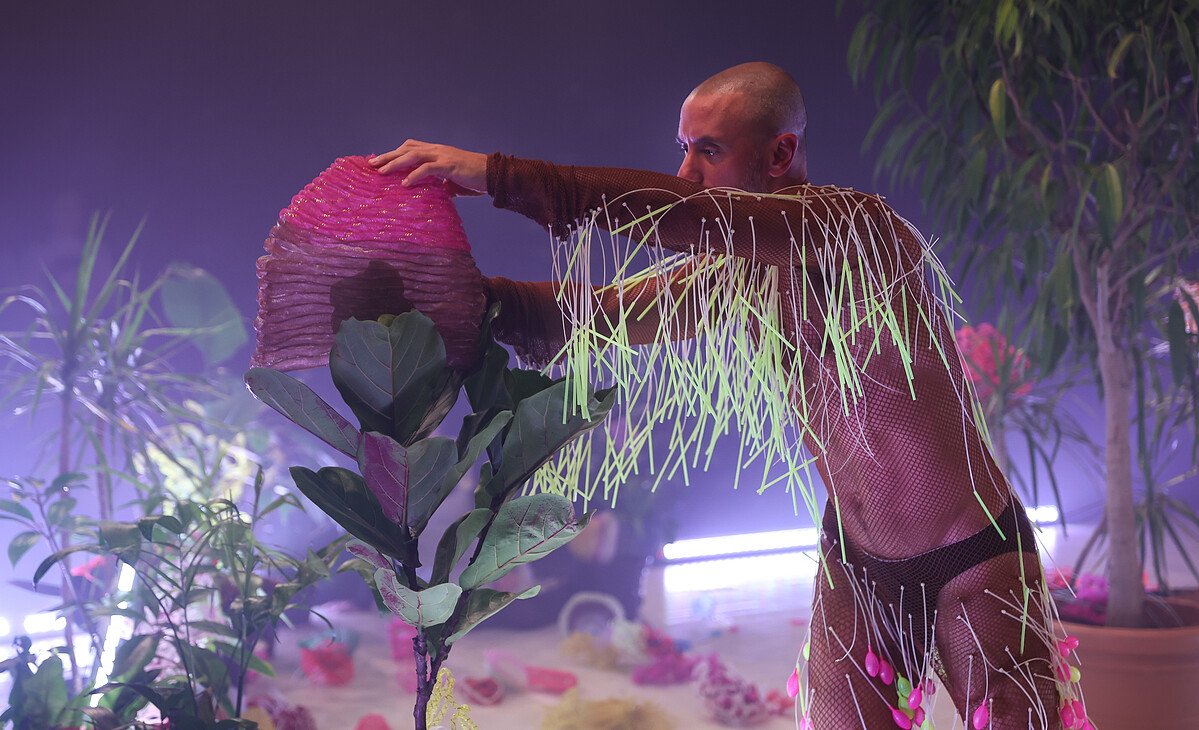 Leeroy New這次在H+T《萬象森羅》擔任服裝、舞台暨裝置設計,他和聚思製造端的合作始於2017年大稻埕國際藝術節駐村,此次他和DYCTEAM的合作是自H+T《萬象森羅》的前導延伸,談論作品關注人類與生態之間的關係,Leeroy New在創作上秉持讓既有物件化為新的面貌,DYCTEAM則是基於友善地球理念,透過設計轉化,將風格美感與永續的結合成為可能,兩者理念不謀而合。展品以「PET寶特瓶」為基底,融合了DYCTEAM獨特的緹花碎邊布料,每件作品都以有機且有意義的方式呈現。雖然整體以黑白色系為主,但透過光影的折射,展示出繽紛多彩的效果。