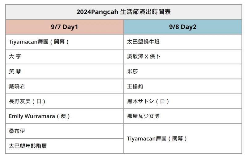 演出陣容|王榆鈞、米莎、戴曉君、太巴塱蝸牛班、那屋瓦少女隊、桑布伊、HengJones 大亨、 笑琴、吳欣澤 X 保卜·巴督路、長野友美、黒木サトシ、Emily Wurramara、太巴塱年齡階層、Tiyamacan 舞團