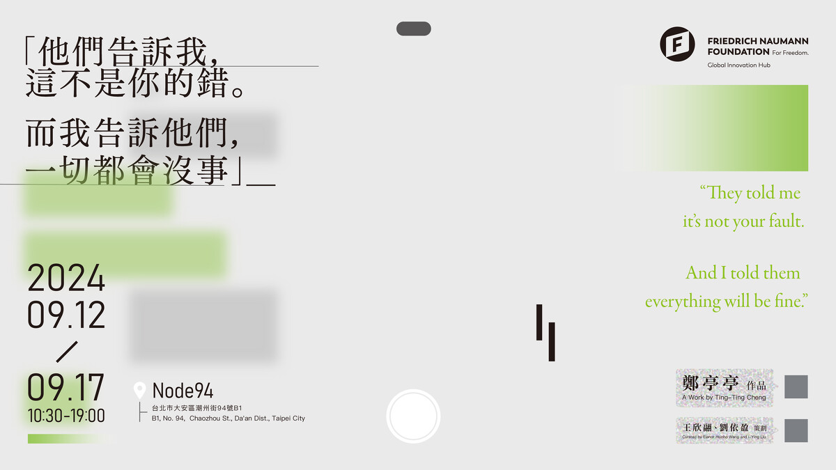 限期六天的沉浸式體驗展:「他們告訴我,這不是你的錯。而我告訴他們,一切都會沒事」,2024 年 9 月 12 日至 9 月 17 日在台北潮州街藝文空間 Node94 登場。這是藝術家鄭亭亭接受德國弗里德里希諾曼自由基金會在台辦事處(FNF Global Innovation Hub,以下簡稱 FNF基金會)邀請,針對近年驚擾台灣社會的「數位性別暴力」事件,重新轉化的最新藝術創作。