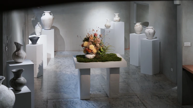 因此展覽「合起來時 要裝些什麼?」裡頭的花器可以分開使用,也可以結合在一起,看似殘缺,但其中的美,需要由觀者和收藏者來詮釋,不同的排列組合成就百花齊放的美麗姿態。
