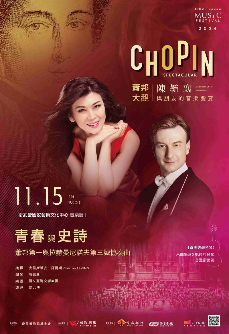 2024奇美音樂節「蕭邦大觀:陳毓襄與朋友的音樂饗宴」由知名樂評家與節目製作人焦元溥擔任策劃及導聆,並邀請鋼琴家陳毓襄演繹多首蕭邦名作。除了壓軸場之外,即將於10/19登場的「溫柔與豪情:蕭邦、舒伯特與拉赫曼尼諾夫的室內樂」,祭出法國巴黎製琴名家維姚姆(Jean-Baptiste Vuillaume)打造的大小提琴,演出蕭邦、舒伯特、拉赫曼尼諾夫等三位浪漫派大師不同風情的經典名曲。10/26「英雄與傳說:蕭邦詼諧曲與敘事曲全集」鋼琴獨奏會,由陳毓襄演奏蕭邦詼諧曲、敘述曲全集,包括家喻戶曉的第一組夜曲、最溫柔的《搖籃曲》與最威風的《英雄》波蘭舞曲等。