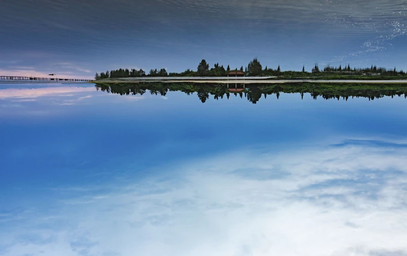 從西表島眺望由布島的景色。在黎明前的短暫瞬間,藍天倒映在水面上,形成如鏡子般美麗的畫面。