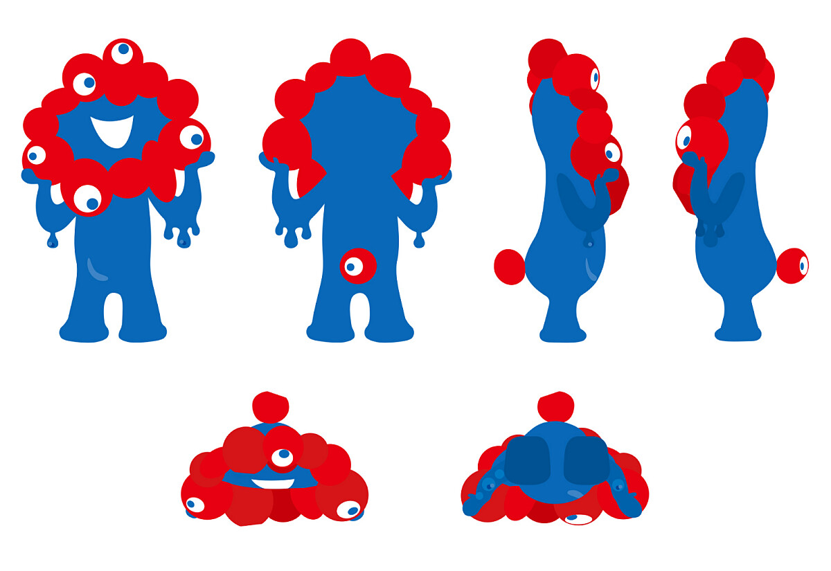 2025大阪世博官方吉祥物為「脈脈 ミャクミャク」(Myaku-Myaku),由日本繪本作家山下浩平先生設計,靈感源自1970大阪萬博的象徵「太陽之塔」。紅色的部分是細胞,藍色的部分是水,能變化成不同的形態。