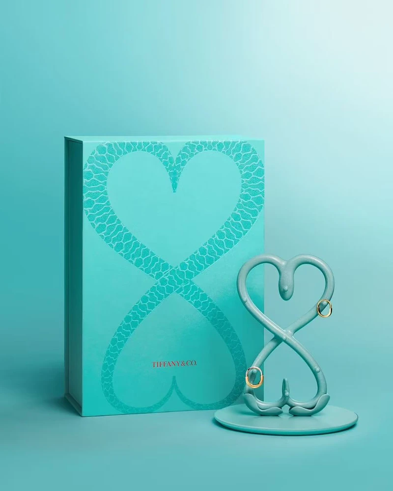 在 Tiffany & Co. 的珠寶設計中,心形元素承載著深刻的情感底蘊,是表達愛意與承諾的經典符號,而蛇在東方文化中則象徵著智慧和神秘。藝術家王令塵將心形元素與蛇的獨特曲線巧妙糅合,以心心相印的對稱結構打造新春視覺符號,詮釋愛的真諦。數字8除了象徵著財富與欣欣向榮,也是無限循環符號∞,寄託愛意永恆且生生不息的美好期許。