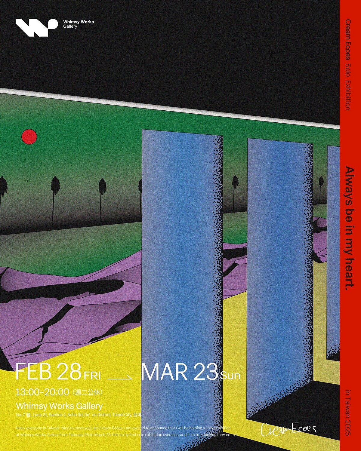 Cream Ecoes 最初從事音樂創作,因為對專輯視覺設計與藝術表達的興趣,開始踏入繪畫領域。他的靈感經常來自電影、旅行,以及日常生活中的觀察,例如城市中的光影變化、建築造型與景觀結構。他善於從這些細微之處提煉靈感,轉化為畫面中的架構與氛圍,最終構築出獨特的視覺敘事。作為他首次的海外個展,這次展覽將圍繞記憶、時間與情感交錯的主題,透過獨特的視覺語彙,探索那些隨時光流逝而變得模糊,卻依然存於內心深處的片段。