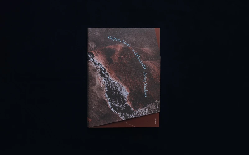 平面設計師黃耀霆負責攝影集《物件、線條、之後漸漸看見影子》的封面設計與內頁排版,對他來說,朱特的照片如同一趟公路旅行,令他想起《浪蕩世代》中一成不變的美麗風景,因此,他將標準字設定為天藍色。封面的火山岩紋路貼合書名,思緒的形成與其中曲折如同岩石,慢慢堆砌出紋理與線條,有了高低起伏之後形成了影子;刻意的斜度讓書衣稍微古怪,像是被貓咪打亂,跳脫工整,畢竟想法總是不會像公路一樣筆直。