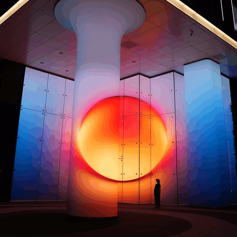 《陽顏 SUN HUE》以「臺北的永晝」為發想,結合時間流動與光影設計,於都市核心地帶創造出一顆不隨天氣與晝夜消逝的「數位太陽」。作品隨著實際時間推移,呈現從晨曦微光、正午烈陽到夕陽西下的色彩與情緒變化,使觀者即便在陰雨綿綿或夜色低垂的時刻,也能感受到陽光灑落的視覺經驗與心靈慰藉。