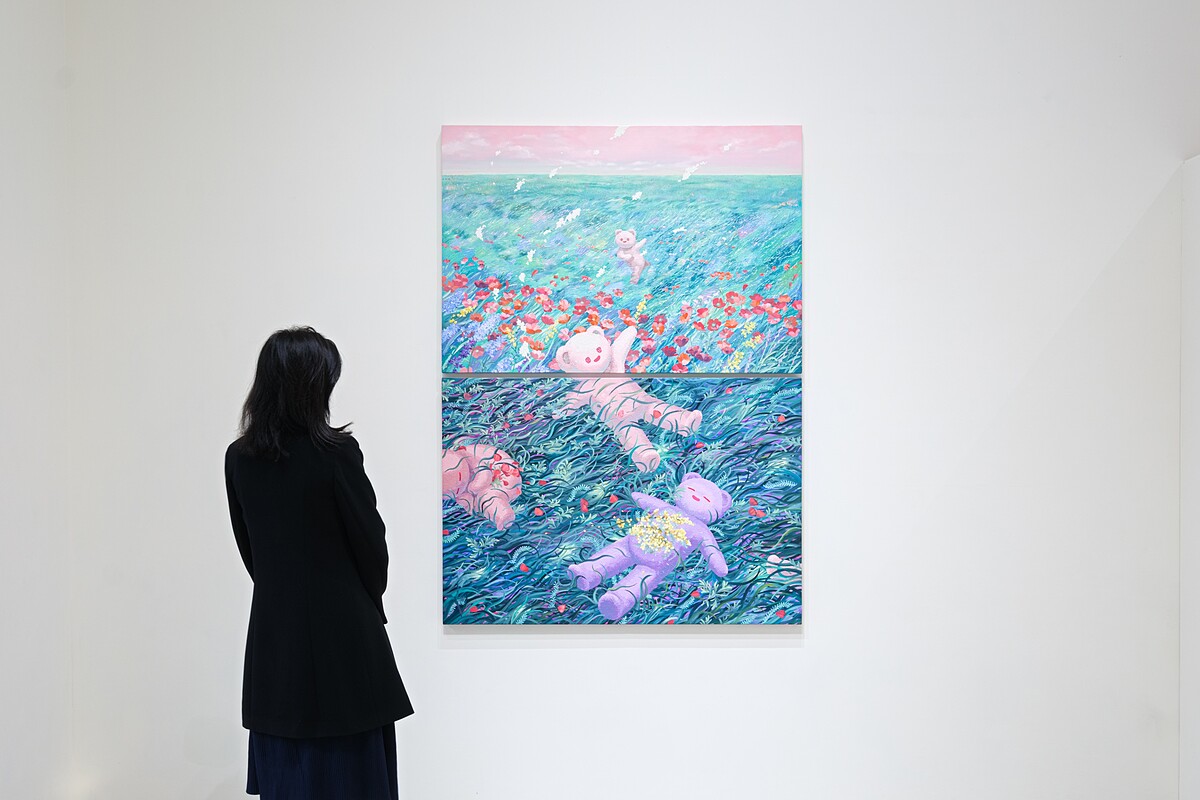 江口綾音繪畫中反覆出現的似熊非熊的「KUMA」,既非寫實的生物描繪,也非單純的虛構角色,而是自然現象與情感想像之間的介質。靈感源於北海道「可愛」卻「殘暴」的棕熊,他們在畫面中扮演的並非自然界被動的旁觀者或共生者,而是具能動性的主體——悠然恣意地仰浮於海面之上,攪動絢爛海景,掀起接連襲來的驚濤駭浪;也潛行於水下,所經之處潛伏著不可預測的裂變暗流。