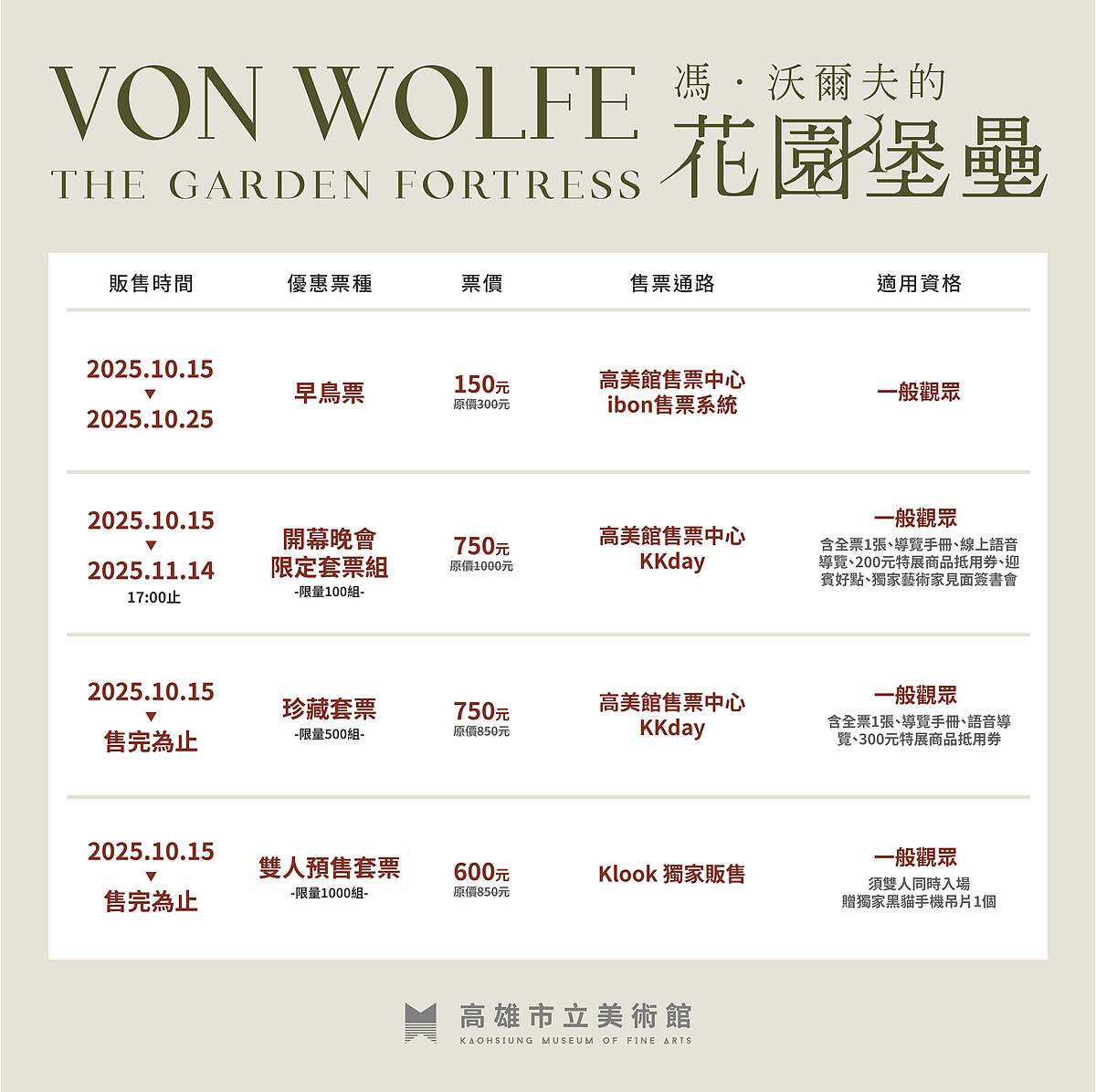 特展珍藏套票包含《馮.沃爾夫的花園堡壘》入場門票、導覽手冊、語音導覽以及300元特展商品抵用券各一,適合看完展想購買周邊商品收藏的觀眾。售價750元,限量500組(售完為止),10月15日起於高美館售票中心、KKday販售。